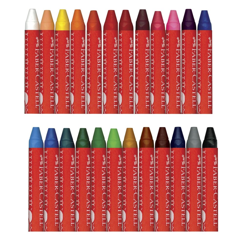 Contents Include: 24 Beeswax Crayons: White, Yellow, Peach, Yellow Orange, Orange, Orange Red, Red, Lime, Green, Teal, Blue, Purple, Brown, Black, Gray, Pink, Magenta, Rose, Grass Green, Dark Brown, Ocean Blue, Sky Blue, Mustard, Dark Blue in a sturdy plastic storage case