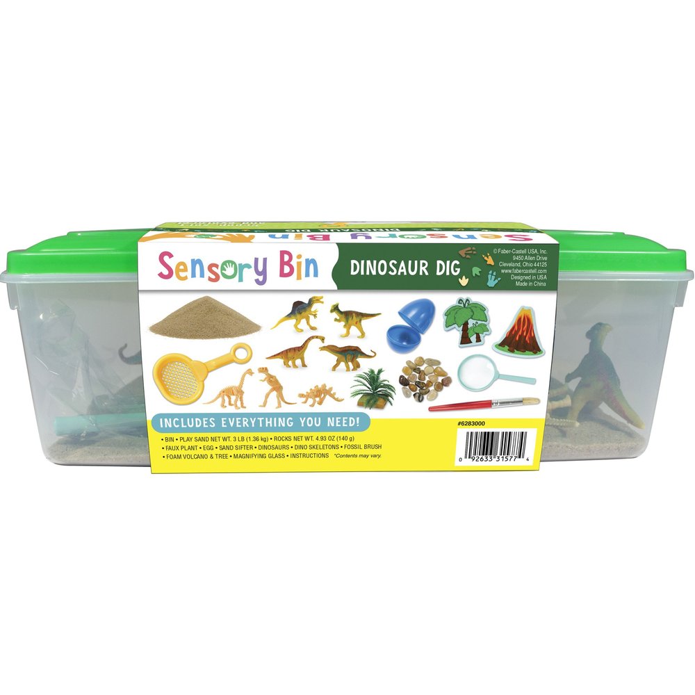 Contents Include: Bin, play sand net wt. 3 lb (1.36 kg), faux plant, rocks net wt. 4.93 oz (140 g), egg, sand sifter, dinosaurs, dino skeletons, fossil brush, foam volcano & tree, magnifying glass, instructions