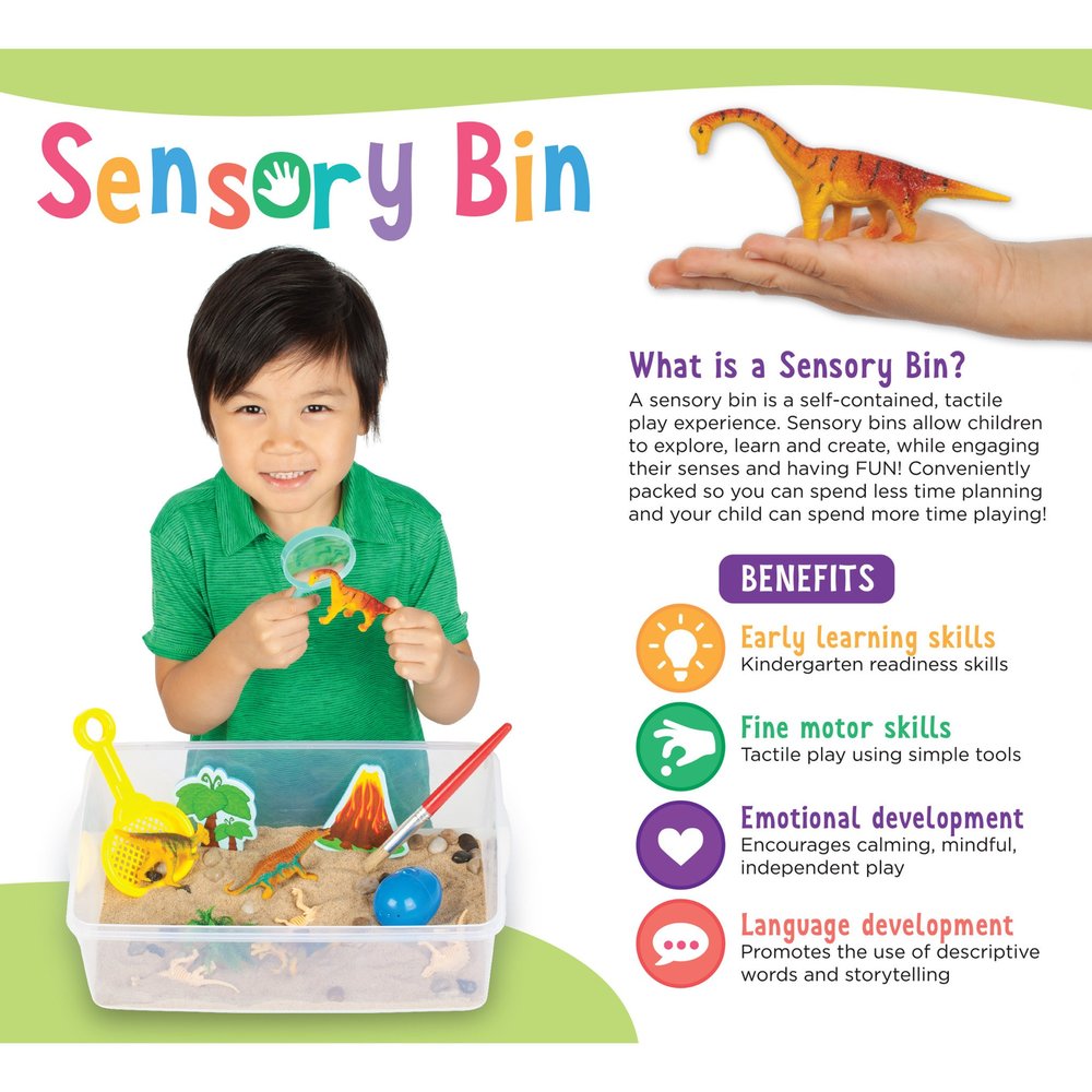 Go on a dinosaur adventure while engaging your sense of touch with a dinosaur themed sensory bin! Play with sensory sand, faux plants and dino skeletons to build fine motor skills and promote sensory development