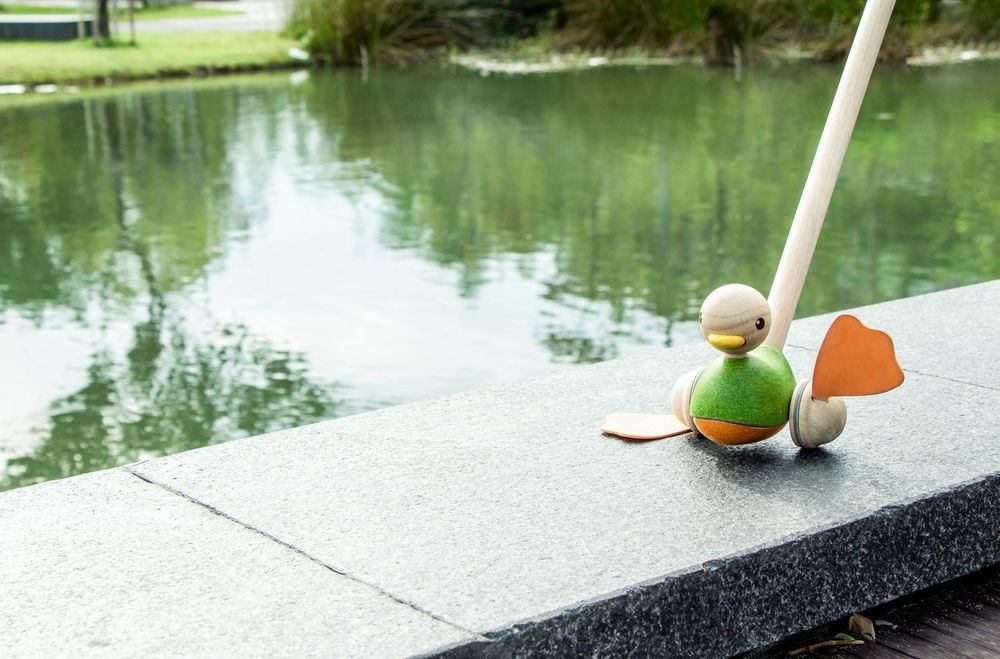 Toddlers will love pushing their funny duck along by the wooden handle, as its feet go round and round with a flip-flop sound