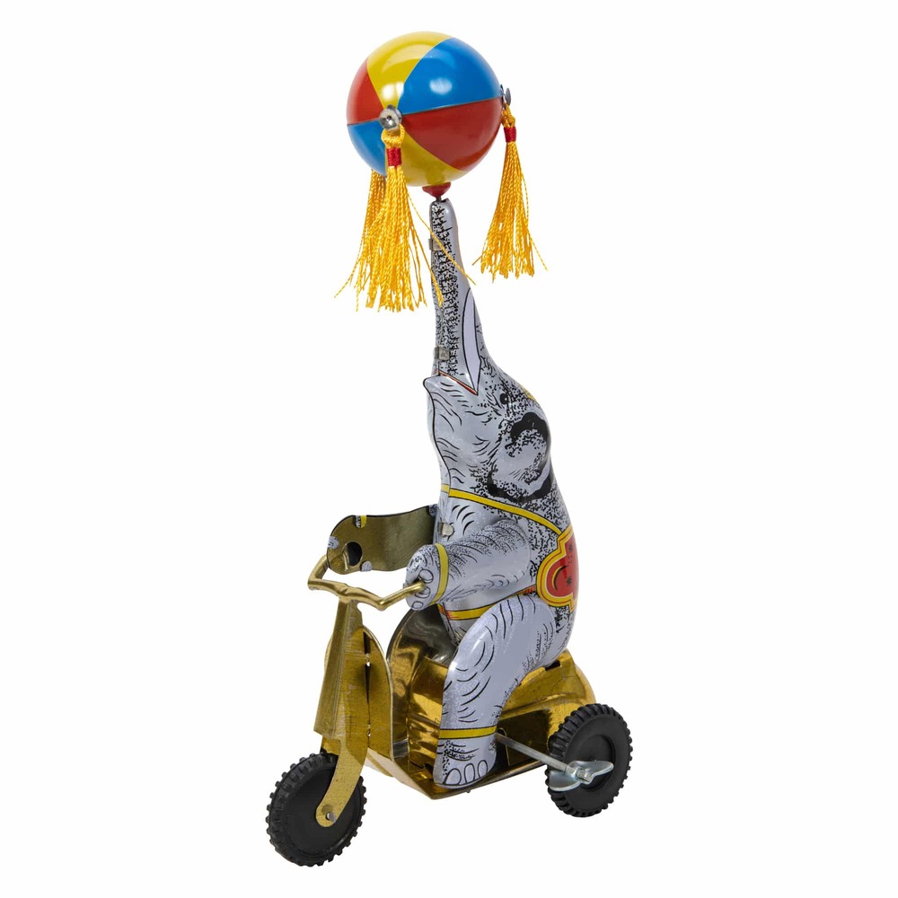 Take a ride with this fun loving elephant! This classic toy has all the moves. Just use the key to wind up this talented elephant and watch the ball spin as the bike moves forward.
