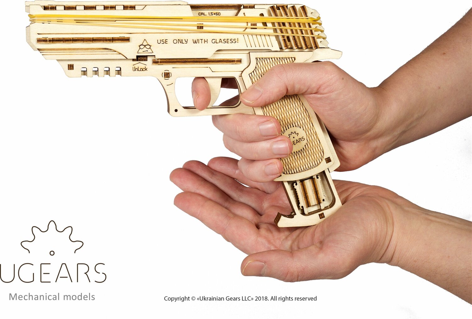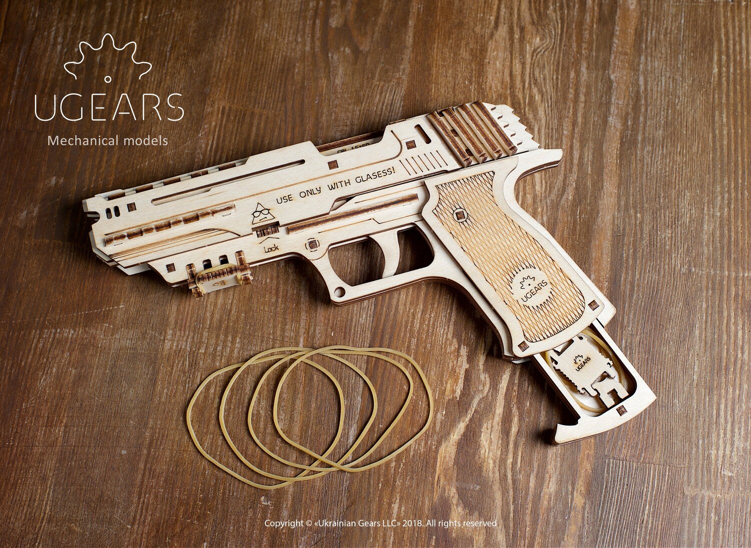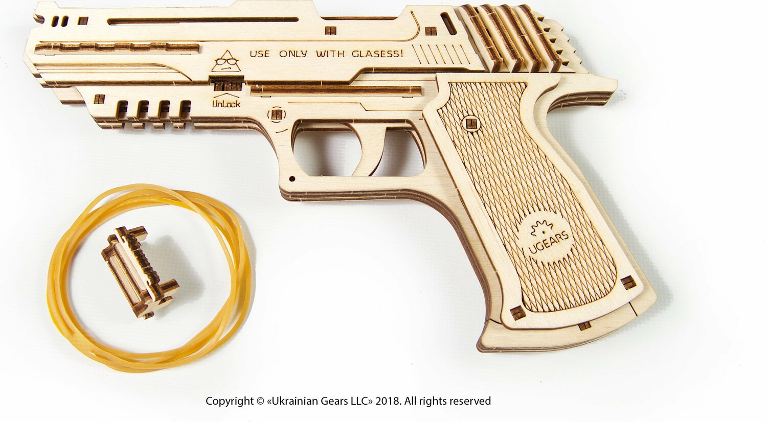 UGears presents a new unique item for your collection of wooden models a" loaded with fun, aimed at positive emotions, the Wolf-01 mechanical handgun. This new arrival to UGears latest range is not a plain wooden toy where functionality is limited to imaginary shooting by means of yelling aœBang-bang!a The Wolf-01 is a proper mechanical handgun that can make up to 5 shots per round. It has outstanding performance and technical specifications, including the most important a" a huge load of safe and peaceful fun! The Wolf-01 shoots rubber bands of 2.4 Ð¥ 0.6 in caliber and has an effective firing range up to 33 feet. Smart and elegant design ensures that your gun fits your hand perfectly and is very convenient to hold and aim. Quite simple and comprehensive assembly will not take much time. In one evening, you can equip your whole family with these new toys and have a grand family fun-battle or shooting match. Stylish dashing and chic, the Wolf-01 is your weapon of choice in case you play some spy games. A secret compartment in the handle will conceal a microfilm or extra rubber-band-bullets. For night-time missions the gun is equipped with a special quick-release fixture for a light-torch. The gun has a safety lock that will prevent unwanted release and misfires. Eco-friendly and safe, the Wolf-01 will add positive emotions to your home and office! Assemble it and learn to use the gun differently and peacefully. Technical Specs: Caliber:' 0.6 x' 2.4' in Barrel length: 9.1 in Total height: 5.1 in Width: 1 in Weight: 0.86 lbs Capacity: 5 rubber bands Firing range: up to 33 ft' Package size: 14.6 x 6.7 x 1.2 in Number of parts:' 62 Level:' Easy Assembly Time:' 1 hour Recommended Age: 14+ Kit weight: 0.9 lbs Manufacturer: UGears